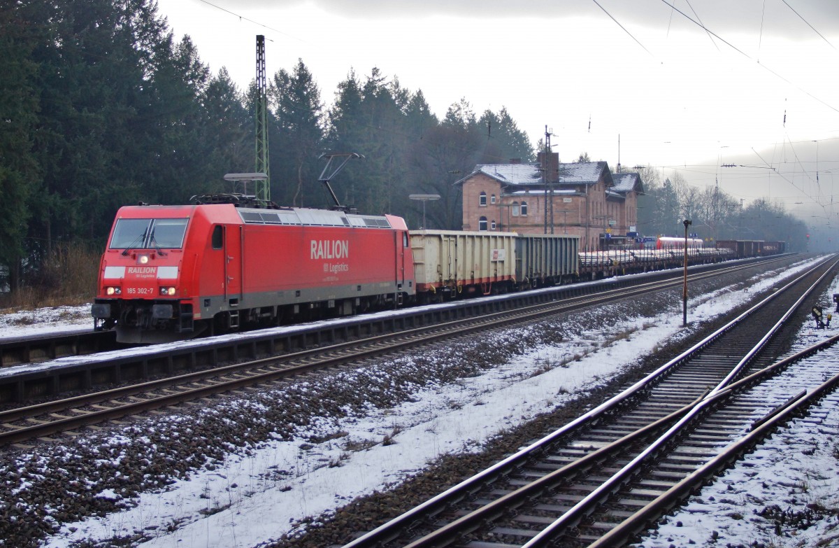 185 302-7 ist mit einen kurzen Güterzug am 25.02.15 in Jossa unterwegs.