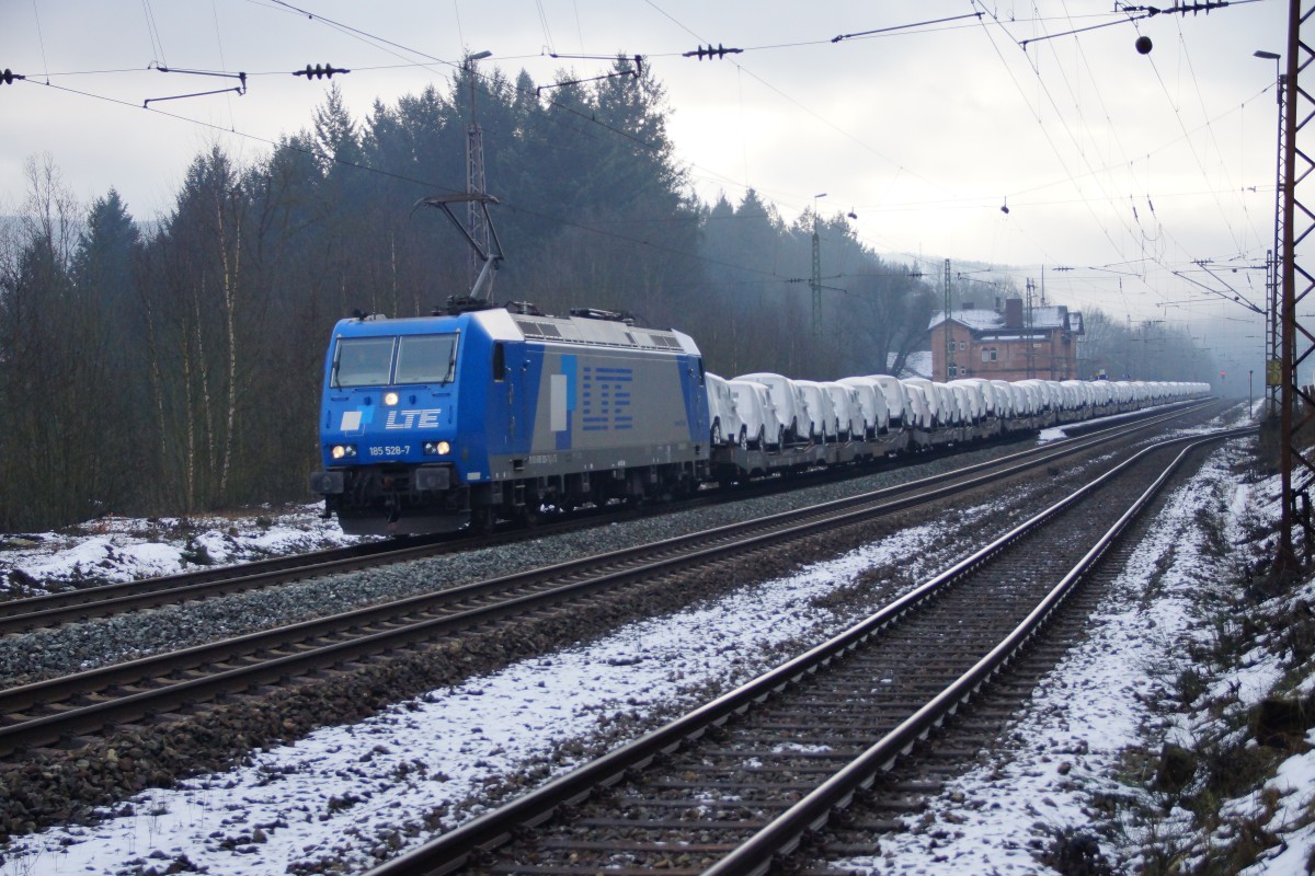 185 528-7 von LTE ist mit einen langen Autozug am 25.02.15 in Jossa zu sehen.