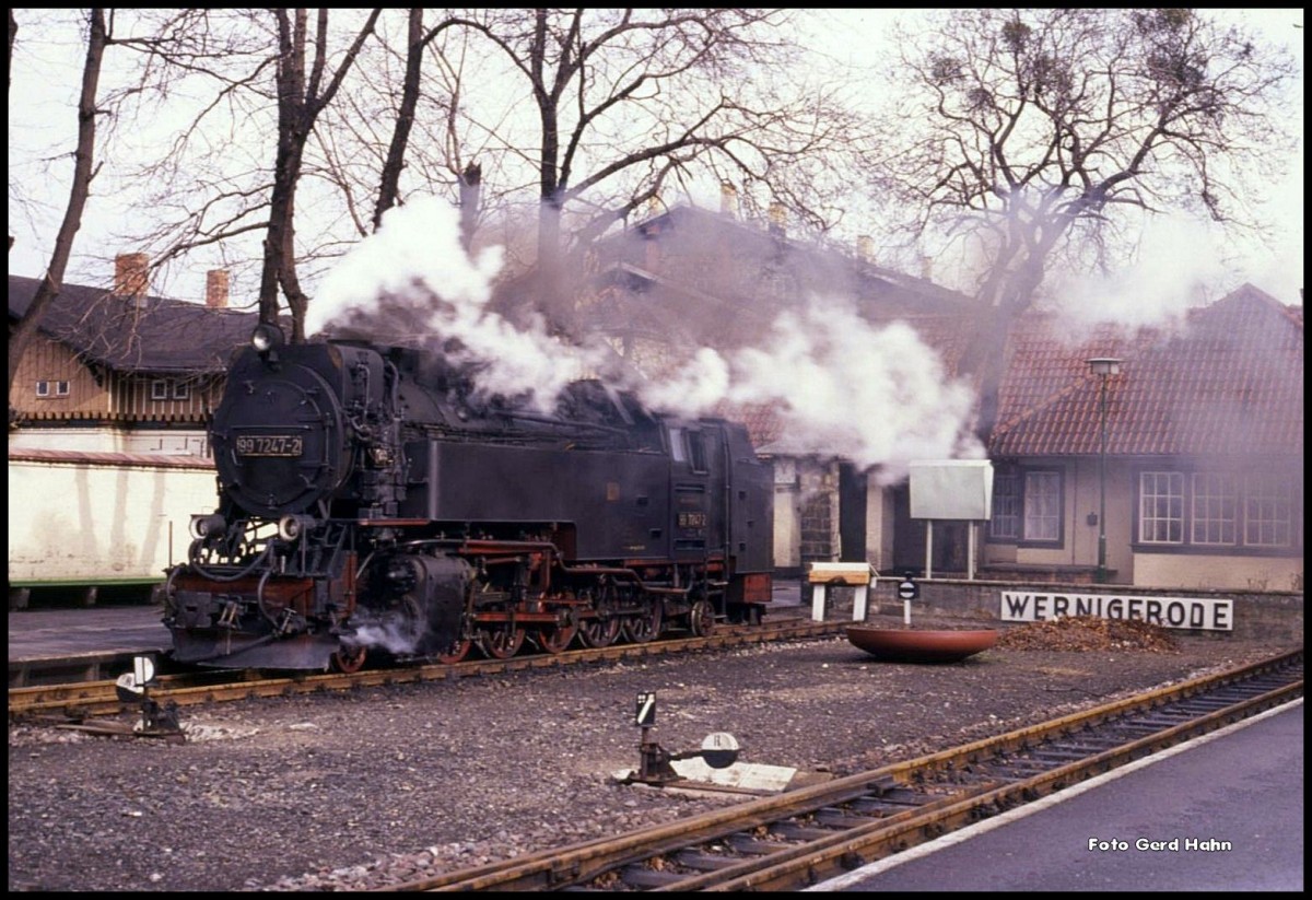997247 wendet im Kopfbahnhof der Harzer Schmalspurbahn in Wernigerode am 14.2.1990. Das verschmutzte Fahrwerk deutet auf eine damals nicht so gute Fahrzeugpflege hin.