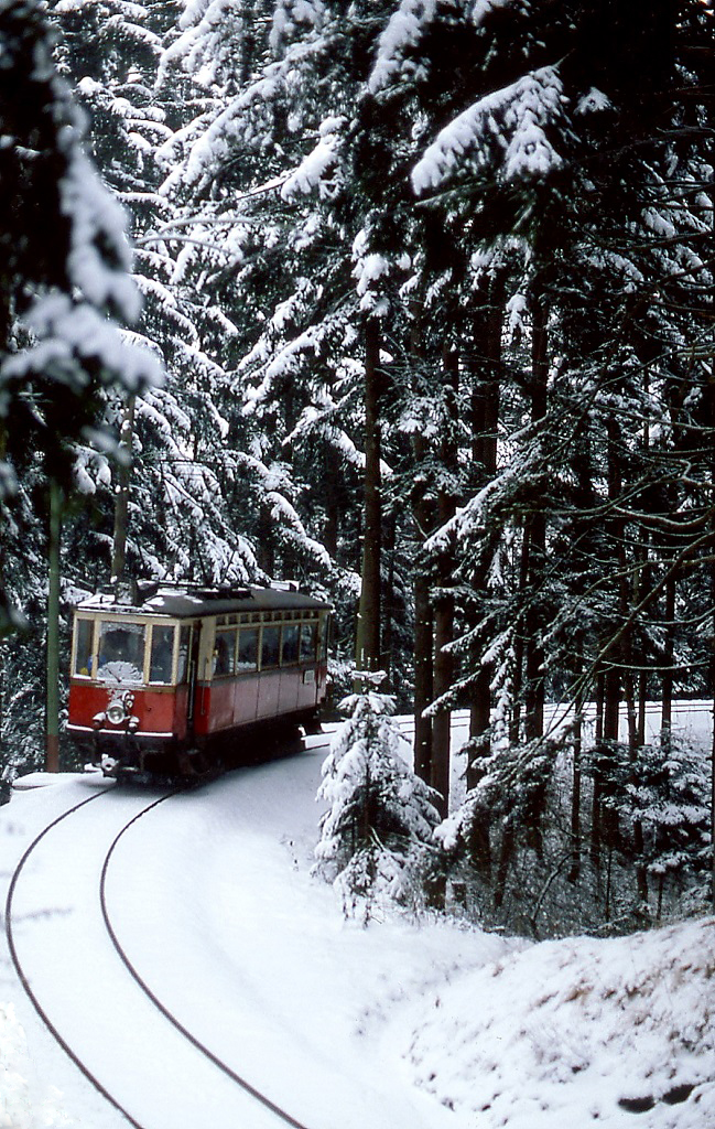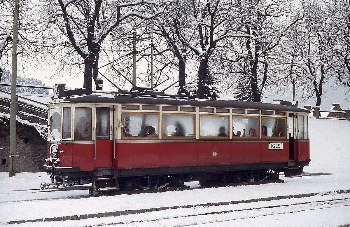 An einem bitterkalten Wintertag Anfang Januar 1980 wartet einer der drei noch vorhandenen  Haller Triebwagen  (Nr. 2-4) auf die Abfahrt nach Igls. 1981 schieden diese 1909 gebauten Fahrzeuge aus dem Plandienst aus.