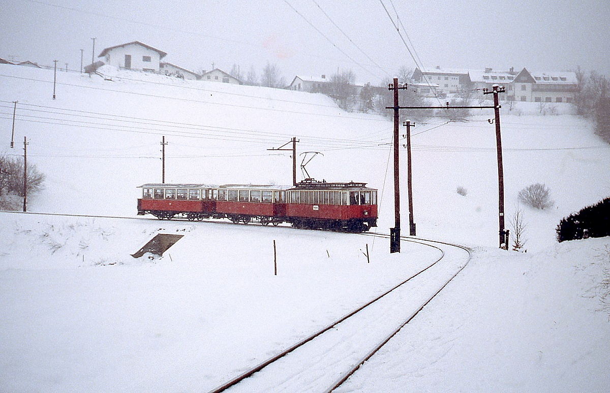 Bei leichtem Schneefall ist ein Zug der Stubaitalbahn Anfang Januar 1980 bei Natters in Richtung Innsbruck unterwegs