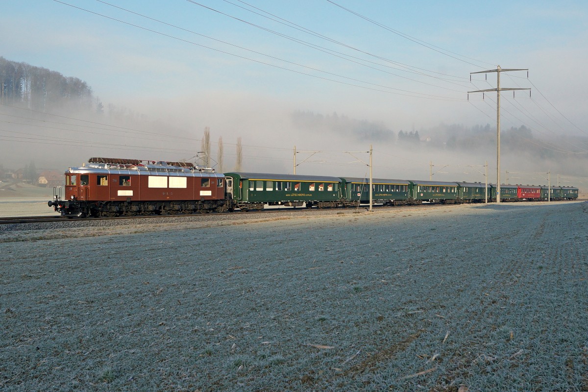BLS: Sonderzüge auf dem alten Stammstreckenabschnitt Herzogenbuchsee-Wynigen. Extrazug nach Kandersteg zur Belle-Epoque-Woche mit der ehemaligen BLS Ae 6/8 208 (anstatt der Ae 6/8 205) von Swiss Train und Wagen des Swiss Classic Train vom 18. Januar 2015. Foto: Walter Ruetsch