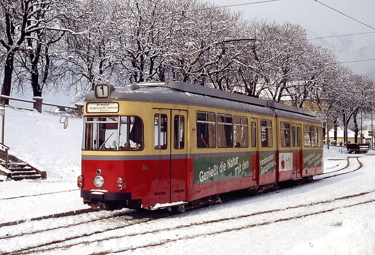 Der ex-Hagener Tw 84 der Innsbrucker Straßenbahn steht im Januar 1980 abfahrbereit zur Hungerburgbahn im Bergiselbahnhof. Diese Fahrzeuge erhielten 1983 die Mittelteile der ex-Bielefelder Wagen und verkehrten nach der Umstellung der Stubaitalbahn auf Gleichstrom nach Fulpmes.