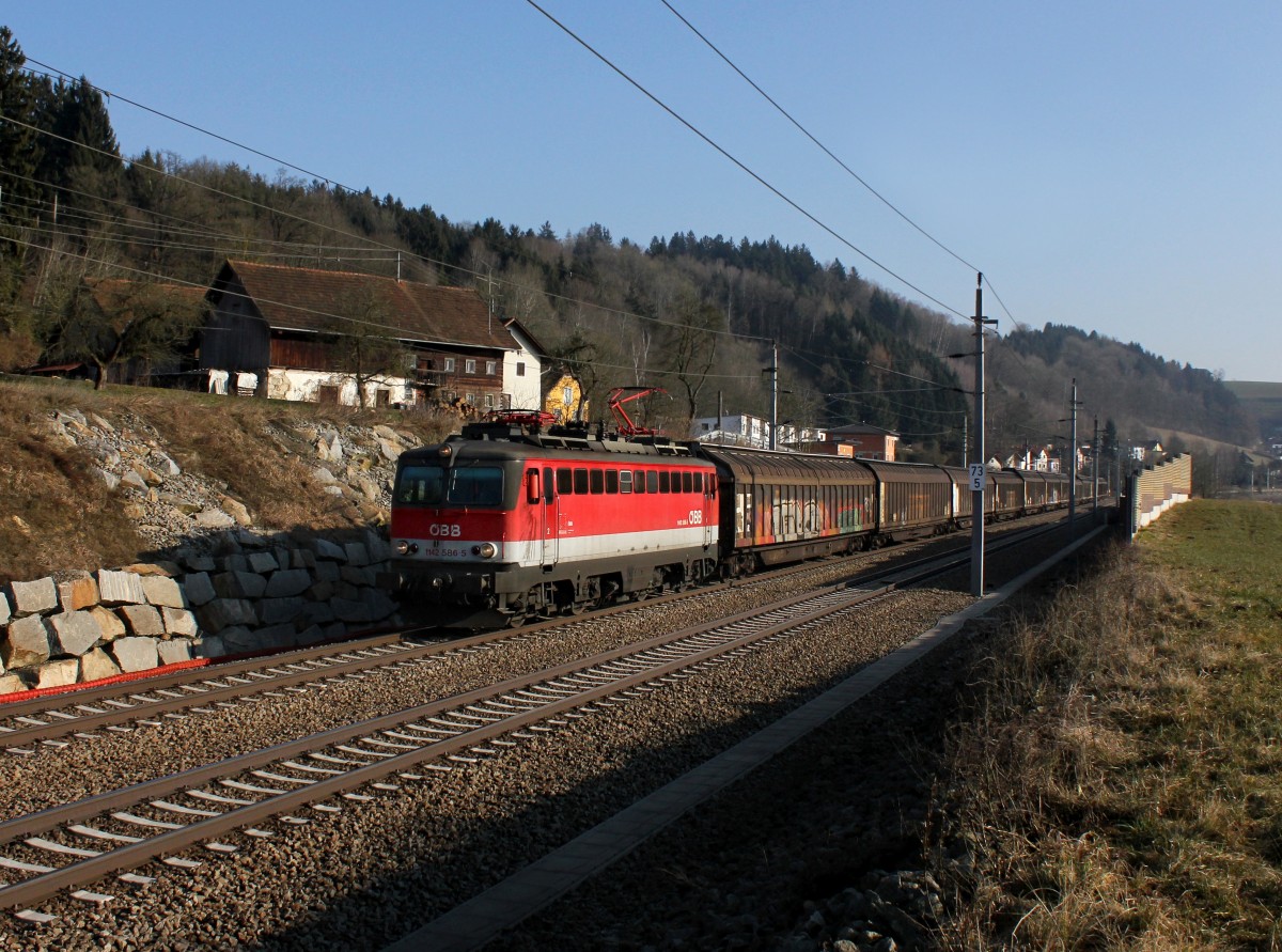 Die 1142 586 mit einem Schiebewandwagenzug am 27.02.2015 unterwegs bei Wernstein.