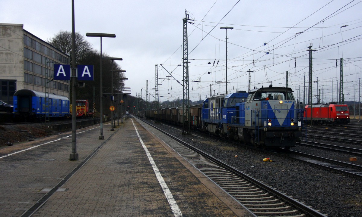 Die V105 "Sally" und V206 beide von der Rurtalbahn fahren mit einem kurzen Bleizug aus Antwerpen-Lillo(B) nach Stolberg-Hammer. Aufgenommen in Aachen-West vom Bahnsteig bei Regenwolken am Kalten Nachmittag vom 25.2.2015.
