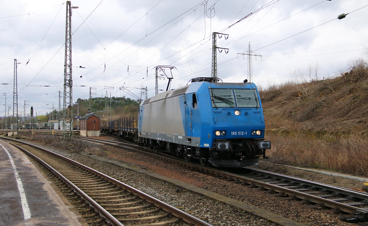 185 512-1 mit leeren Rungenwagen aus Richtung Osten kommend zur Weiterfahrt gen Süden in Eichenberg. Aufgenommen am 22.03.2014.