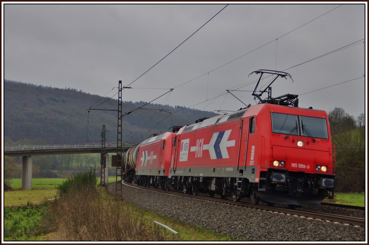 185 589-9 und 145 089-9 von HGK sind am 28.01.15 bei Hermannspiegel mit einen Kesselzug uterwegs.