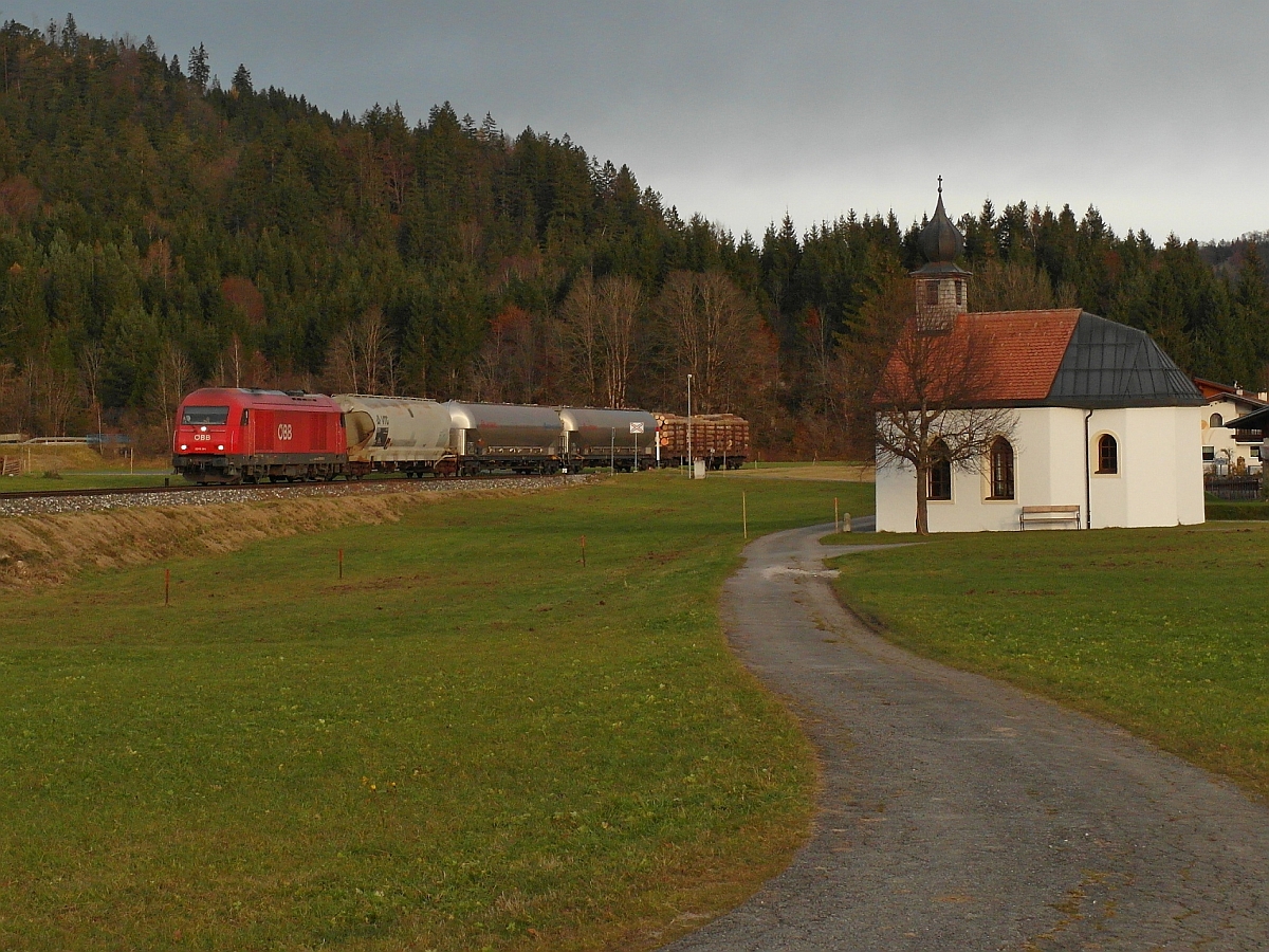 Auf der Fahrt von Vils nach Reutte in Tirol/Hall in Tirol fährt 2016 041 mit den 4 Güterwagen am 11.11.2014 am Ort Musau vorbei.