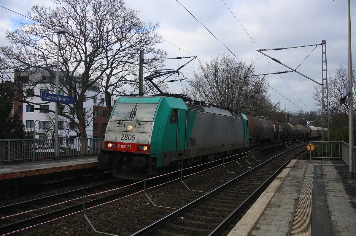 Die Cobra 2805 kommt durch Aachen-Schanz mit einem langen gemischten Güterzug aus Antwerpen-Noord(B) nach Köln-Gremberg und kommt aus Richtung Aachen-West und fährt in Richtung Aachen-Hbf,Köln bei Schneewolken am Kalten Nachmittag vom 4.2.2015.