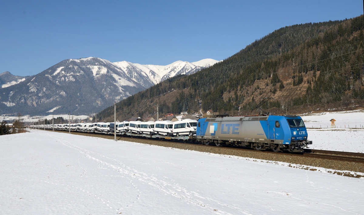 Die LTE 185 529 war am 04. Feber 2015 mit dem Autozug 48955 unterwegs, und wurde von mir in Seiz im winterlichen Liesingtal fotografiert. Im Hintergrund ist der Reiting mit seinen vie Gipfeln de, Gößeck (2214 m), Grieskogel (2148 m), Kahlwandspitze (2049 m) und Klauen (1849 m) zu sehen.