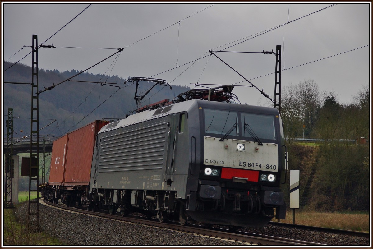 ES 64 F4-840 (E 189 840) ist am 28.01.15 mit einen Containerzug bei Hermannspiegel zu sehen.