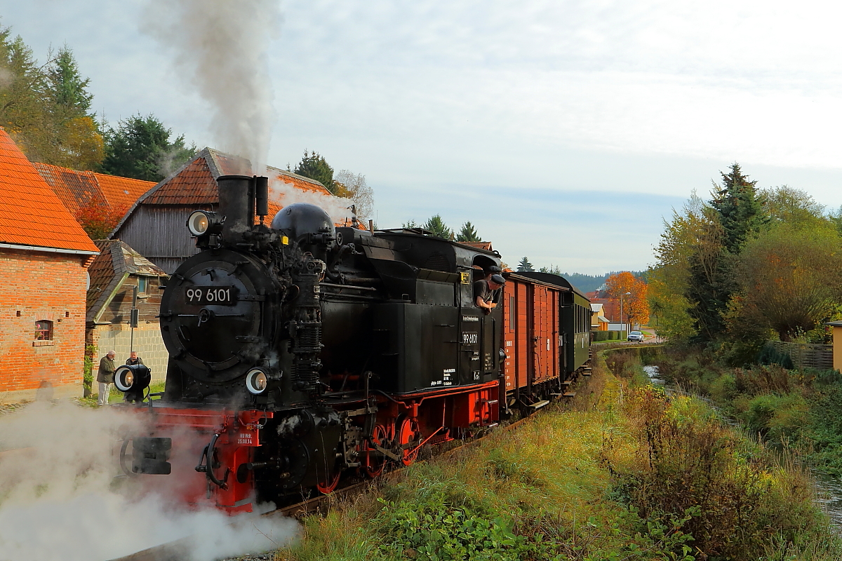 Scheinanfahrt von 99 6101 mit IG HSB-Sonderzug am 18.10.2014 im kleinen Harz-Örtchen Straßberg (Bild 2).