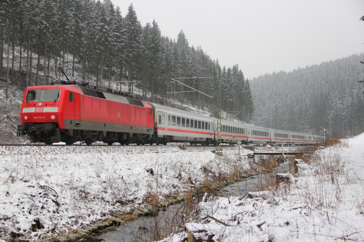 120 113-6 DB schiebt den IC 2300 über die Frankenwaldrampe bei Steinbach am 23.01.2015.