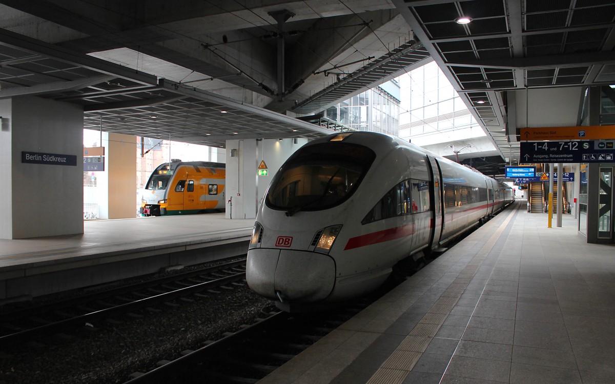 411 013-6 "Hansestadt Stralsund" steht am 17.01.2015 als ICE 1724 (Berlin Südkreuz - Hamburg Altona) im Startbahnhof und wartet auf die Abfahrt. Im Hintergrund hat sich der 445.108 (445 108-4) mit dem RE 79512 (Ludwigsfelde - Rathenow) mit ins Bild geschlichen.