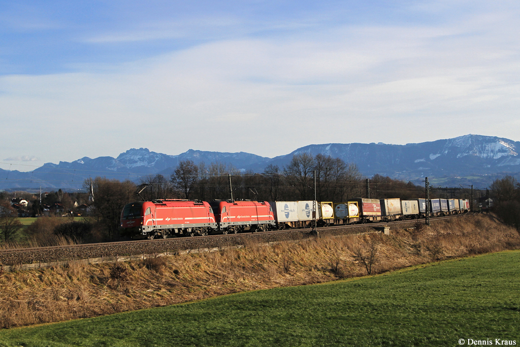 Die EU 43 004 und die EU 43 002 mit einem Autozug am 24.01.2015 unterwegs bei Mules.