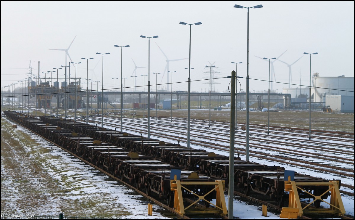 Abgestellte Containertragwagen auf den Gleisen der Tankfarm in Wilhelmshaven... ob es dort günstiger als auf der Vorstellgruppe vom Jade-Weser-Port war, kann man nur drüber spekulieren...