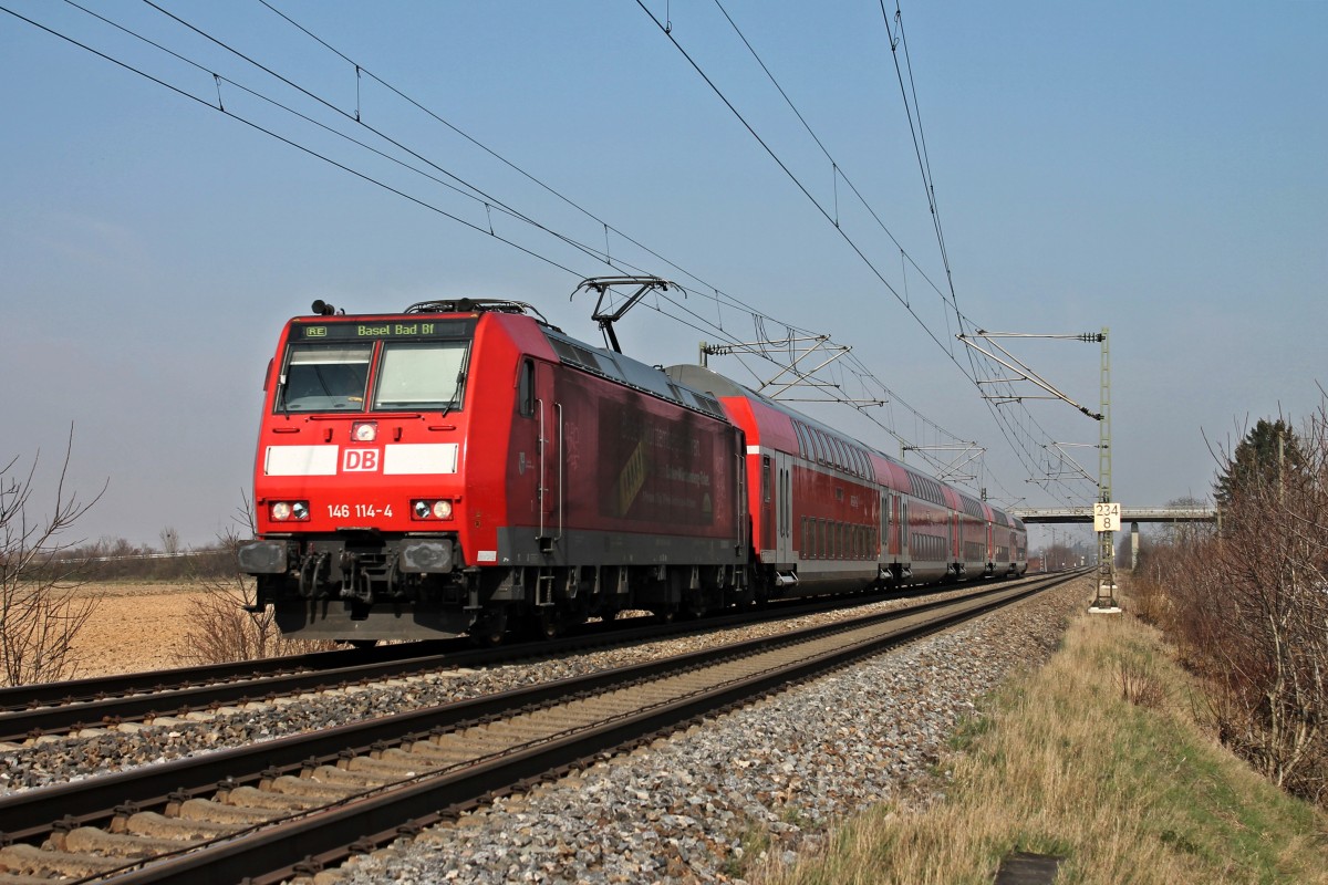 Am 08.03.2014 fuhr 146 114-4 "Baden-Württemberg erfahren" als RE nach Basel Bad Bf, als sie ihrem nächsten Zwischenhalt in Müllheim (Baden) entgegen fuhr.