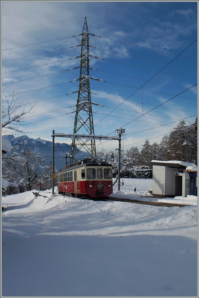 Der trotz bestem Wintersportwetter solo fahrende CEV BDeh 2/4 75 erreicht auf seiner Fahrt als Regioanlzug 1383, von Blonay (622 müM) nach Les Pleiades (1348 müM) unterwegs, den Halt Fayaux 970 müM).