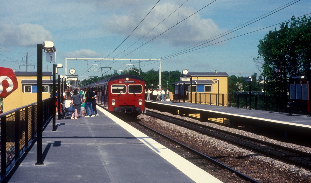 DSB S-Bahn Kopenhagen: Am 27. Mai 1989 wurde der S-Bahnhaltepunkt Malmparken zwischen Skovlunde und Ballerup eröffnet. Diese Eröffnung geschah in Verbindung mit der Einweihung der Verlängerung der S-Bahn von Ballerup nach Frederikssund. - Auf dem Bild erreicht ein Zug nach Klampenborg (Linie C) den neuen Haltepunkt am Eröffnungstag.