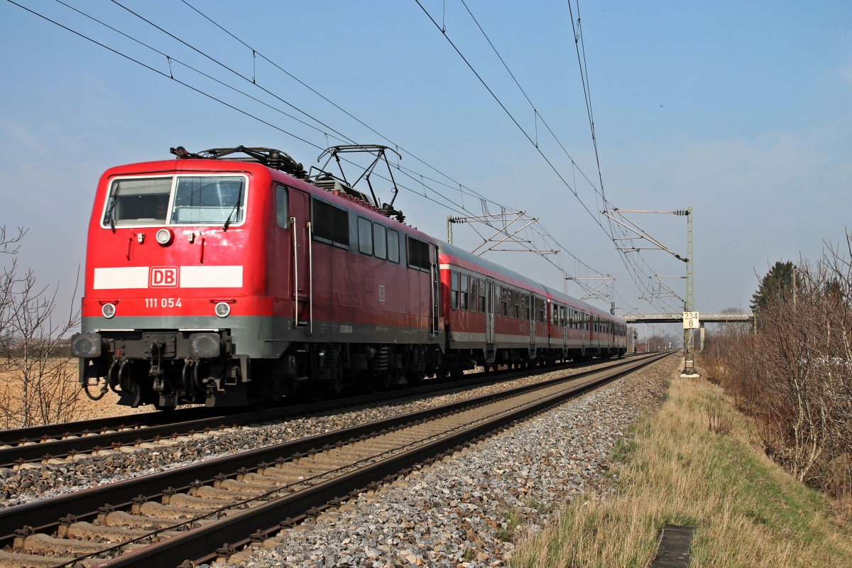Mit einer RB zum Grenzbahnhof Neuenburg (Baden) war am 08.03.2014 die Freiburger 111 054 unterwegs, als sie am kleinen Örtchen Hügelheim ihrem vorletzten Zwischenhalt in Müllheim (Baden) entgegen fährt.