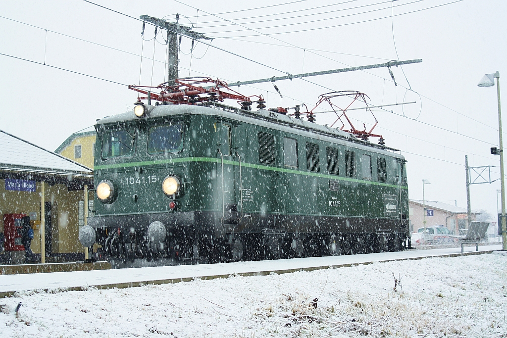 1041.15 der ARGE 1041 am 30.Jänner 2015 bei dichtem Schneefall in Maria Elend.