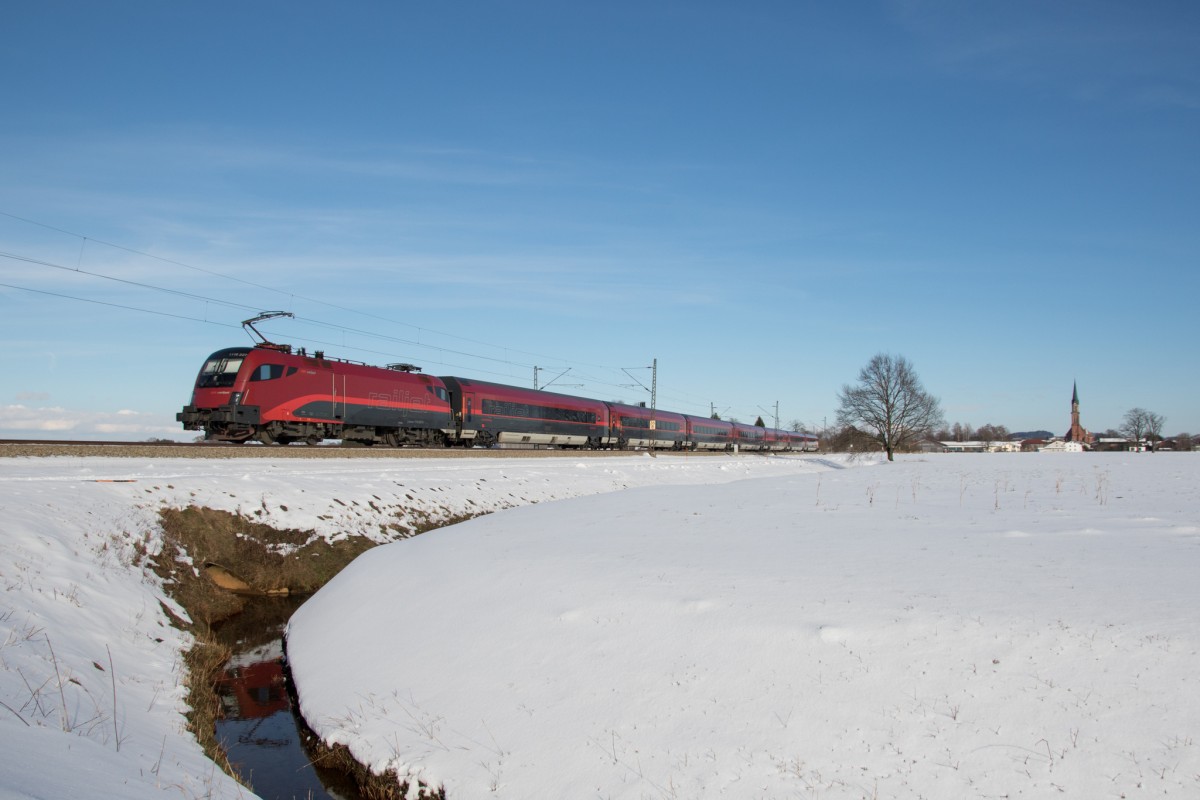 railjet 632 an einem sonnigen Tag im Bahnhof Lienz, 28.1.2015