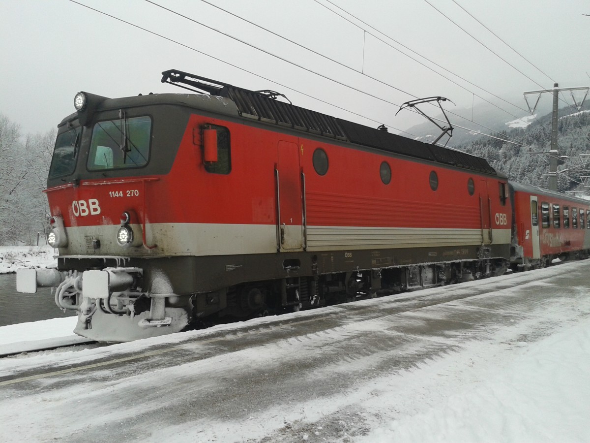 An einem nebeligen Jännerabend ist eine 1144er mit dem R 2265 kurz vor Korneuburg zu sehen. (16.01.2015)