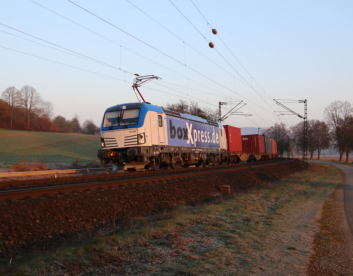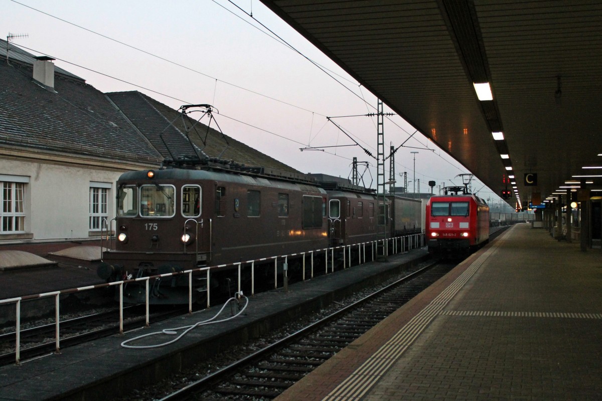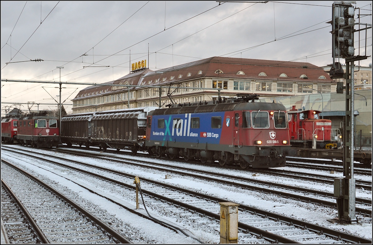 Singen am Morgen. Die Xrail 620 088-5 Linthal steht mit einem Güterzug in die Schweiz bereit. Januar 2015.