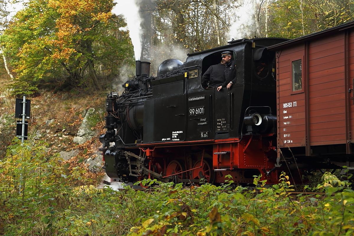 In dichten Dampf gehüllt präsentiert sich 99 6101 am 18.10.2014 im Haltepunkt Sternhaus-Ramberg. Hier erfolgt die Kreuzung mit Planzug P8960 (links neben der Lok zu sehen), bevor sie mit ihrem IG HSB-Sonderzug die Fahrt nach Hasselfelde fortsetzt.