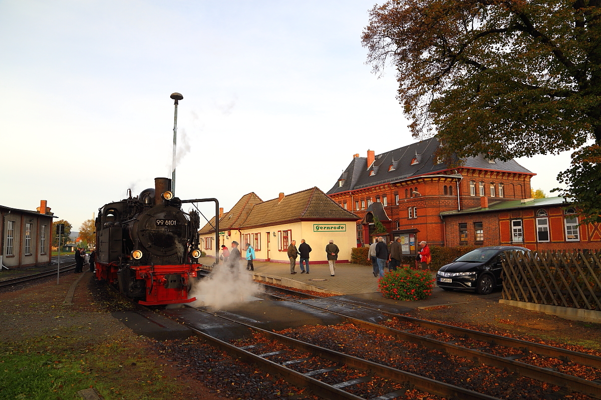 99 6101 mit IG HSB-Sonderzug am 18.10.2014 im Bahnhof Gernrode. Der Zug ist gerade, aus Quedlinburg kommend, eingelaufen und wird nach dem Wasserfassen seine Fahrt in Richtung Hasselfelde fortsetzen.