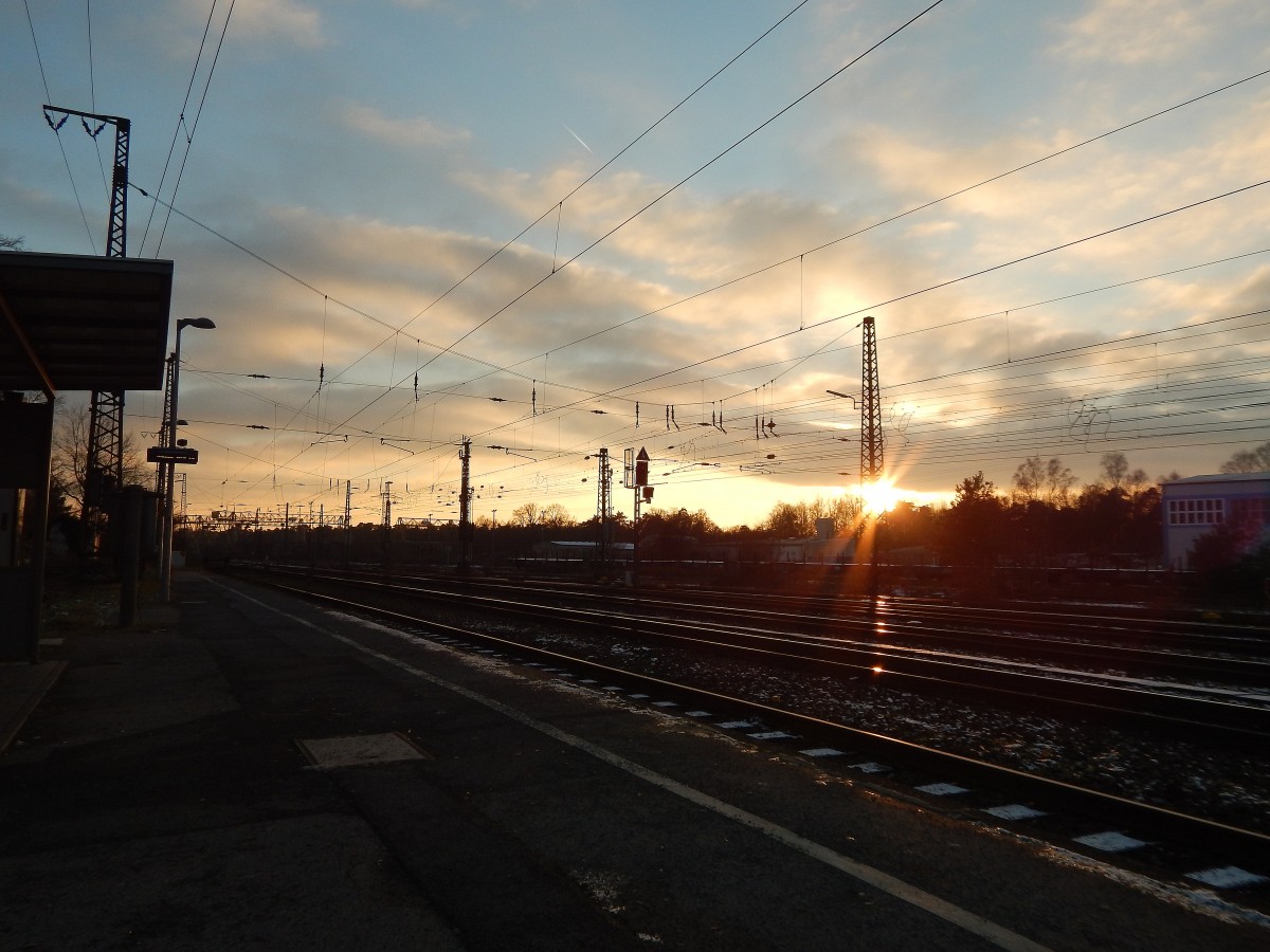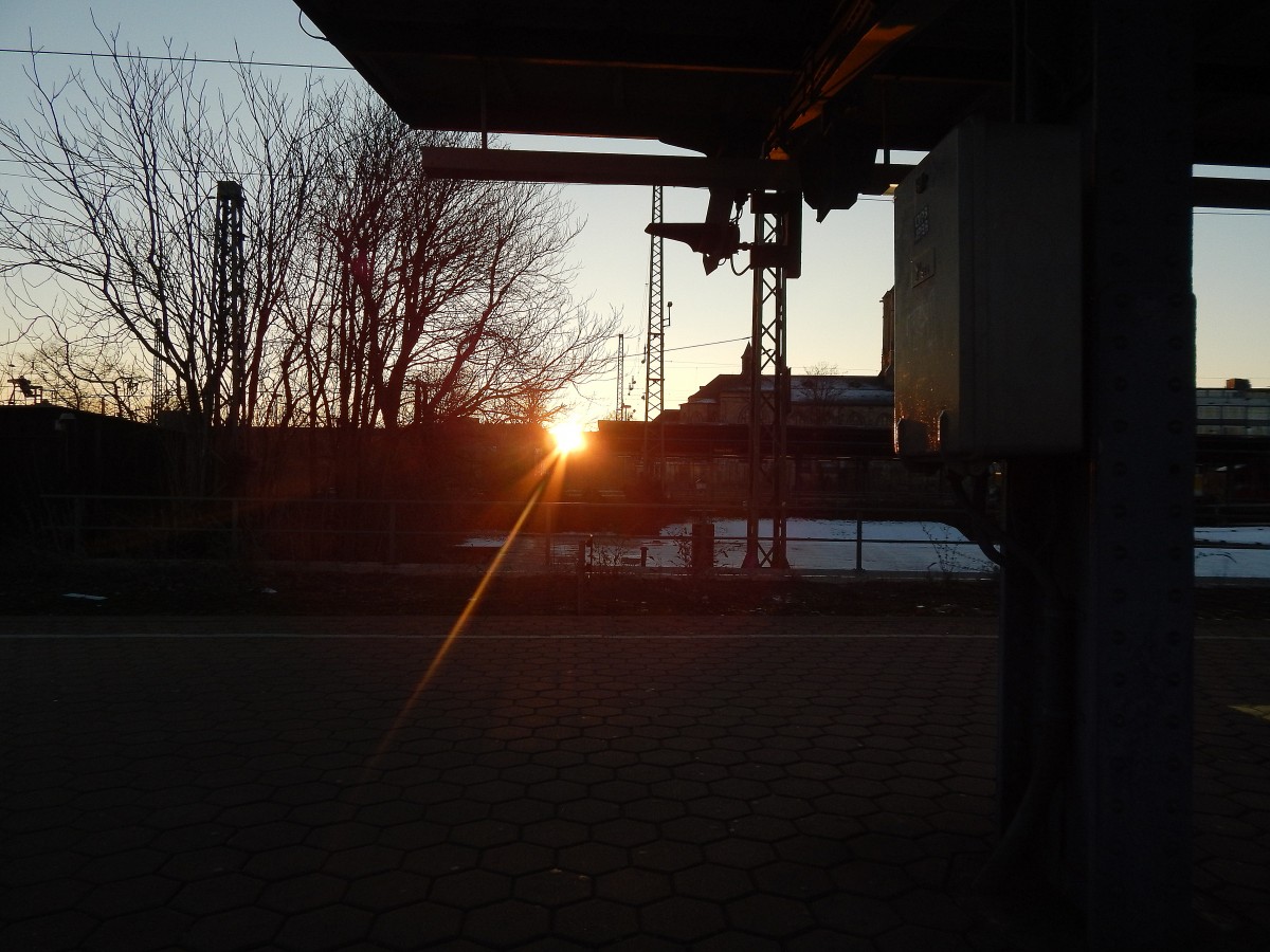 Blick in die aufgehende Sonne im Neusser Hbf auf Gleis 5&6.