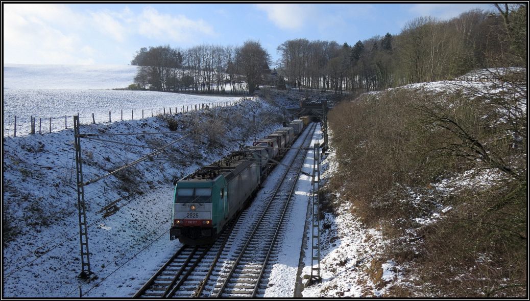 Cobra 2825 fährt mit ihrer Güterfracht aus Belgien downtown nach Aachen West.Hier zu sehen auf der Montzenroute am Gemmenicher Tunnel am 31.Januar 2015.