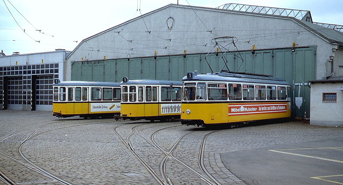 Das Depot der Ulmer Straßenbahn in Söflingen mit Tw 8 und zwei zweiachsigen Beiwagen im Februar 1985