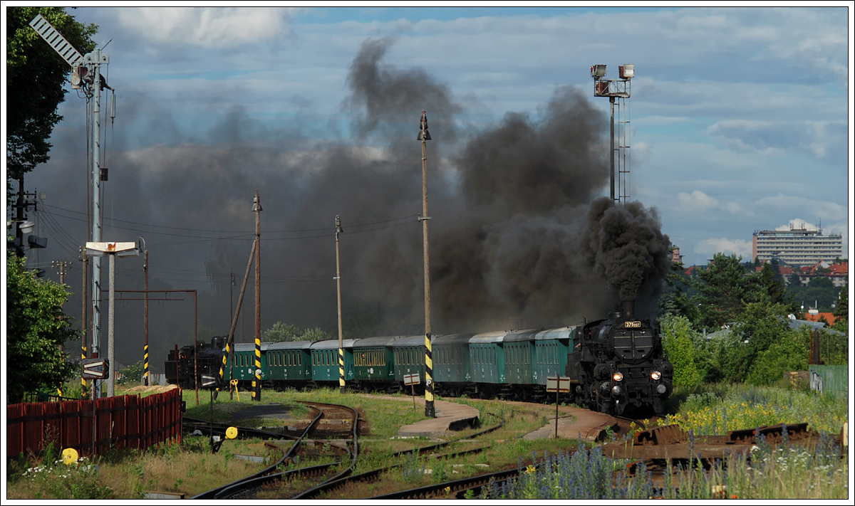 Die als 375 007 beschriftete 310.23 aus Strasshof bespannte zusammen mit 354 7152 (hier als Schublok) vom Prager Eisenbahnklubs KHKD anlässlich des k&k Dampfloktreffens im Eisenbahnmuseum Lužná u Rakovníka am 23.6.2013 einen Fotosonderzug von Praha Masarykovo nádraží (Prag Masaryk-Bahnhof) nach Lužná u Rakovníka. Die Aufnahme zeigt den Zug bei der Durchfahrt in Praha Ruzyne. (Televersion)
