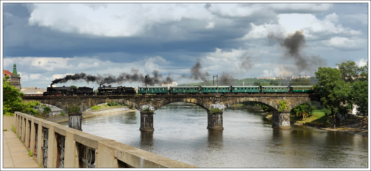 Die als 375 007 beschriftete 310.23 aus Strasshof bespannte zusammen mit 354 7152 vom Prager Eisenbahnklubs KHKD anlässlich des k&k Dampfloktreffens im Eisenbahnmuseum Lužná u Rakovníka am 23.6.2013 einen Fotosonderzug von Praha Masarykovo nádraží (Prag Masaryk-Bahnhof) nach Luzná u Rakovníka. Die Aufnahme zeigt den Zug bei der Querung der Moldau in Prag.