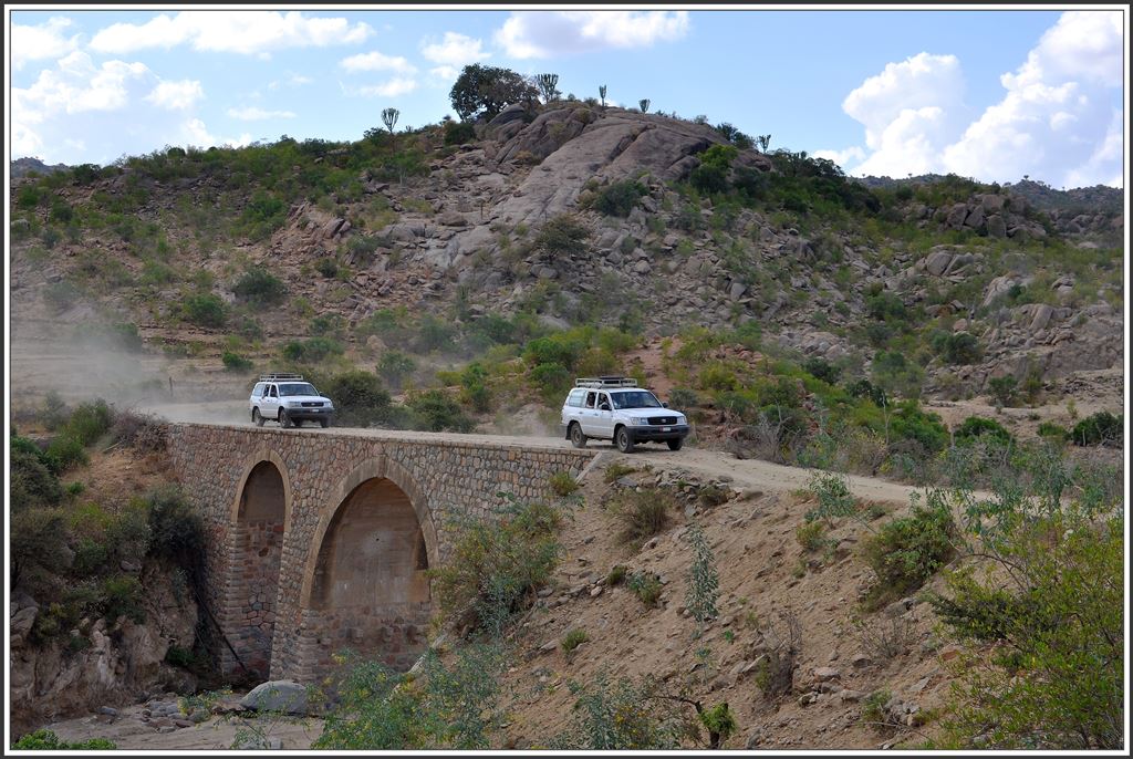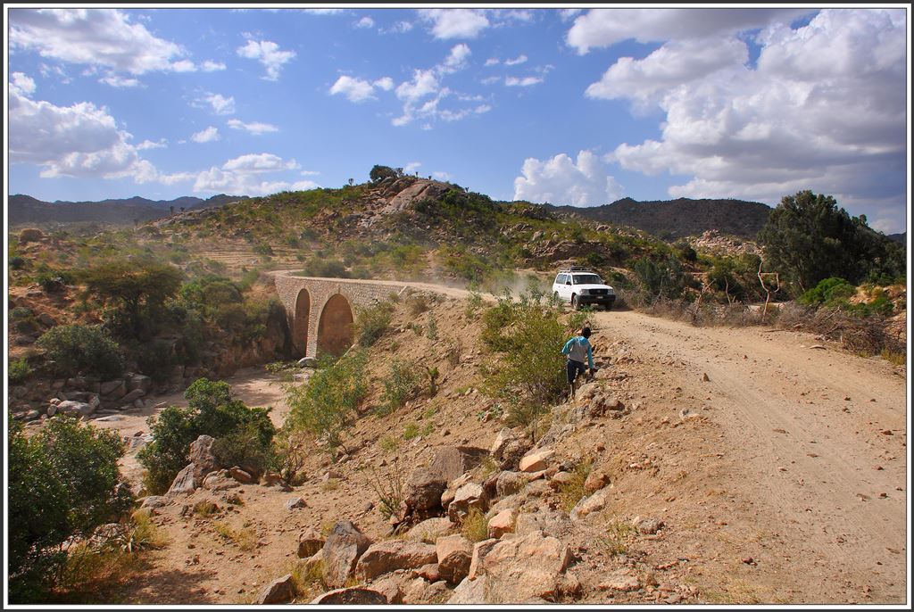 Die Italiener, die diese Bahnstrecke vor bald 100 Jahren gebaut haben, wählten eine Linienführung durchs Gebirge mit grosszügigen Radien und mässigen Steigungen. Die Kunstbauten wie Tunnels und Brücken sind auch heute noch in einem hervorragenden Zustand. Es wäre mit geringem Aufwand möglich die Bahn wieder aufzubauen. Hier zwischen Amba Derho und Abrascico wird der Torrente Bacra Rabei überquert. (02.12.2014)
