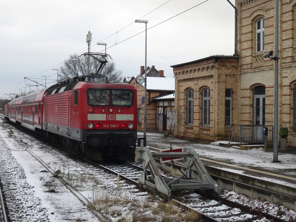 Doppeltraktion 143 im Bahnhof von Halle Trohta auf der Linie S7 nach Nietleben am 25.01.2015 . (Vom Bahnsteig auggenommen)