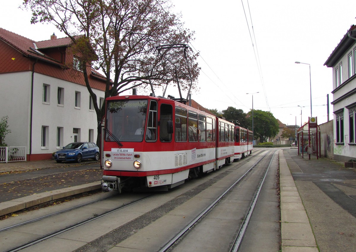 EVAG 405 + 495 als Linie 3 (Urbicher Kreuz - Europaplatz), am 17.10.2014, dem letzten Tag der Erfurter Tatras im Linienverkehr, an der Haltestelle Am Schwemmbach.