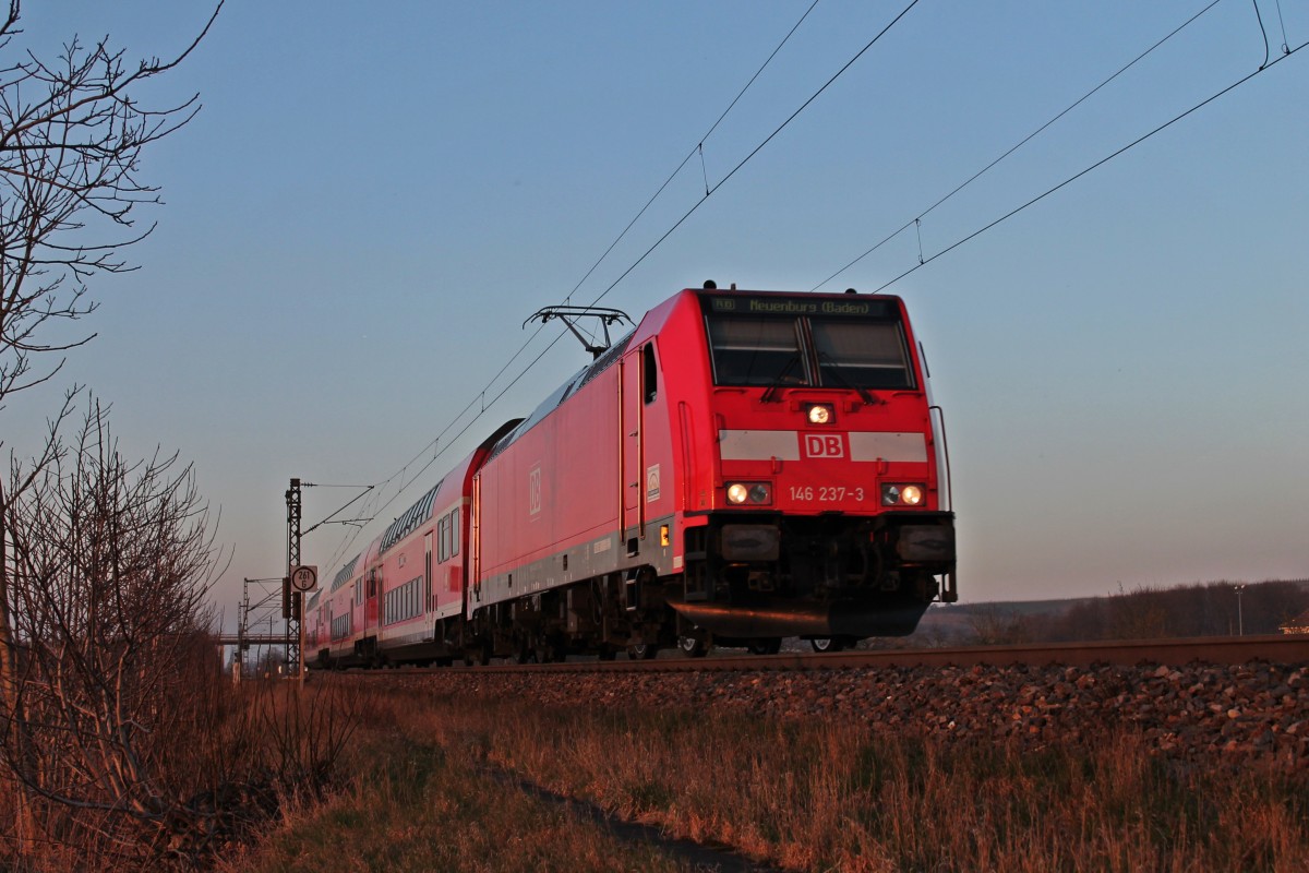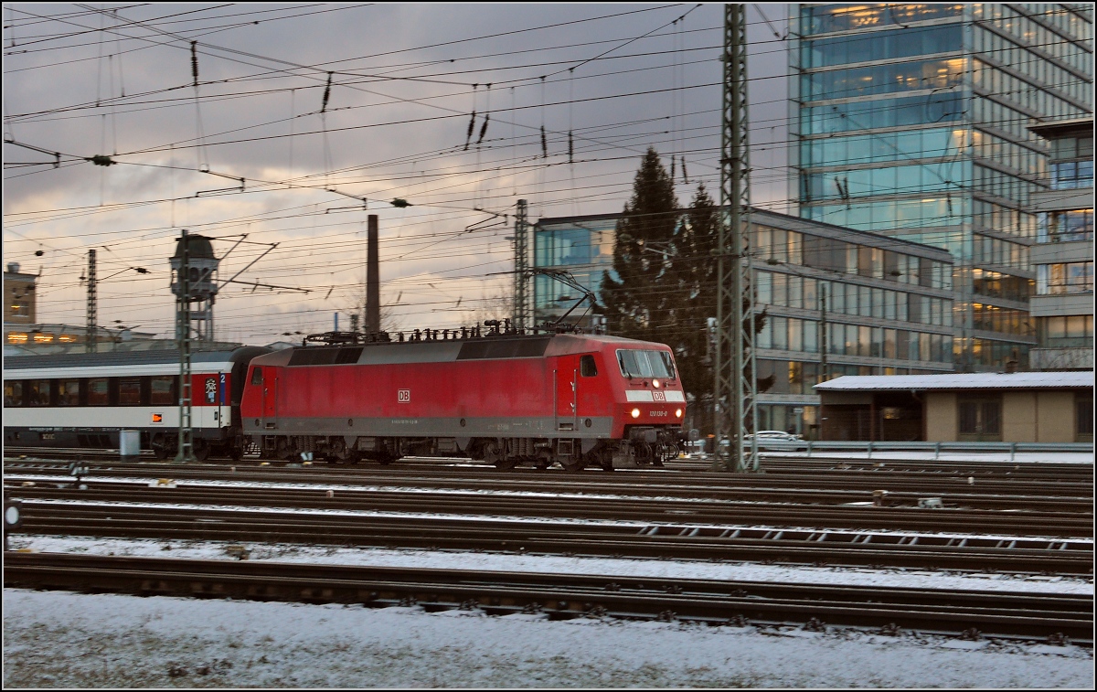 Singen am Morgen. IC 284 mit 120 130-0 beginnt den Reigen des Gäubahnfernverkehrs. Januar 2015.