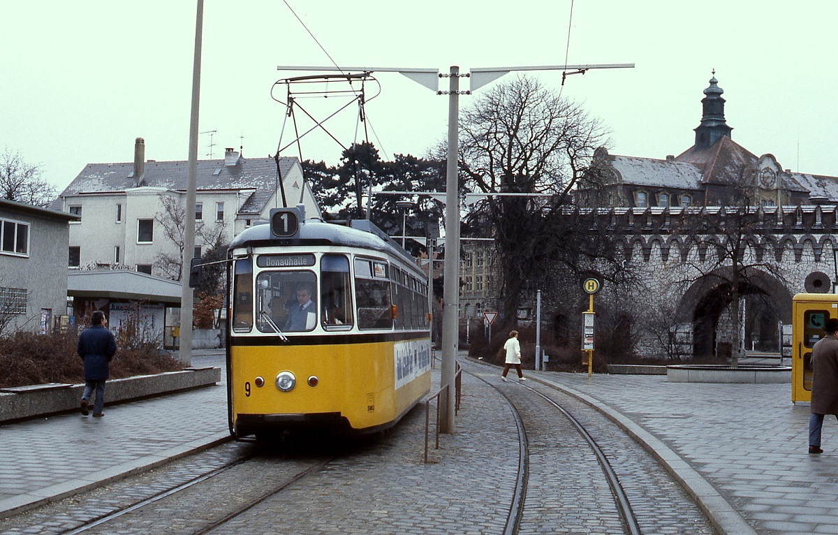 Tw 9 der Ulmer Straßenbahn im Februar 1985 an der Haltestelle Ehinger Tor