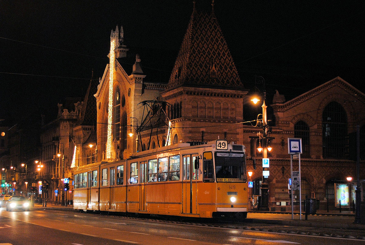 Tw.1419 im Einsatz auf der Linie 49 bei einem Zwischenhalt am Fövam ter, im Hintergrund die große Markthalle. (27.01.2015)