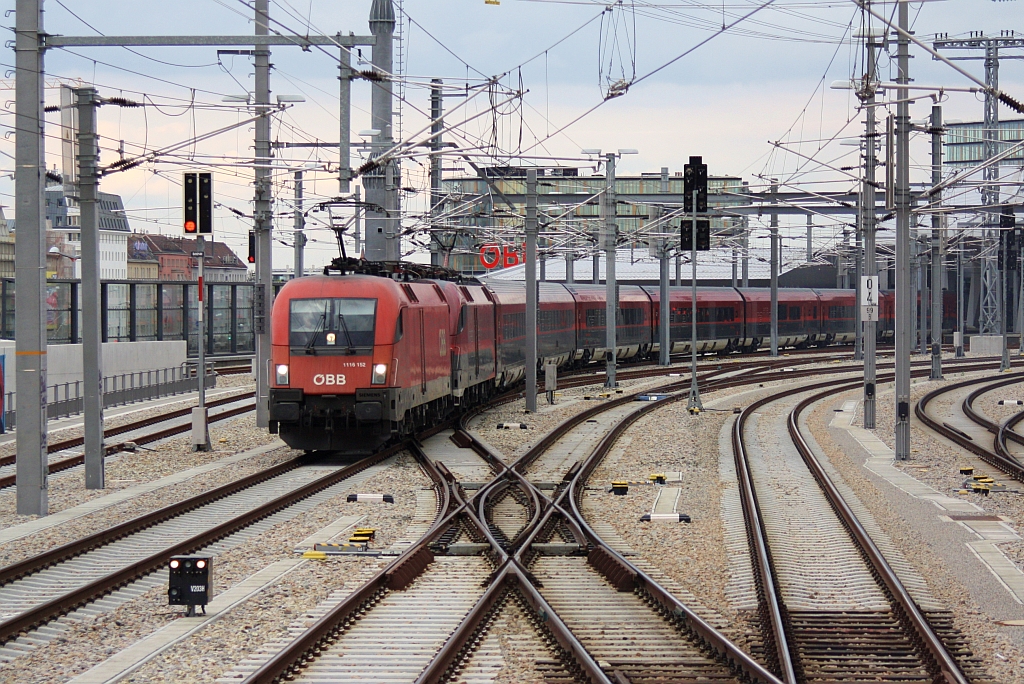 1116 152 als Railjetvorspann am 14.April 2015 in Wien Hbf., aufgenommen vom letzten Fahrzeug des SR 14586.