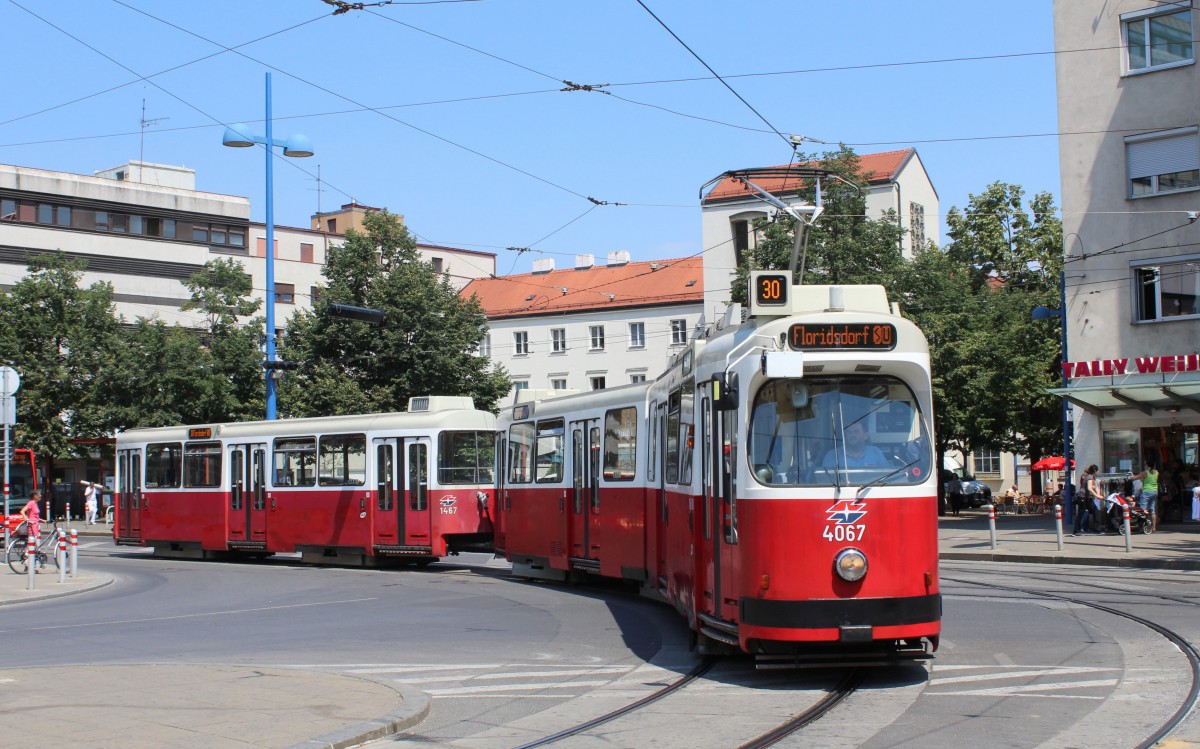 Wien WL SL 30 (E2 4067 + c5 1467) Floridsdorf, Schlosshofer Straße / Franz-Jonas-Platz am 1. Juli 2015.