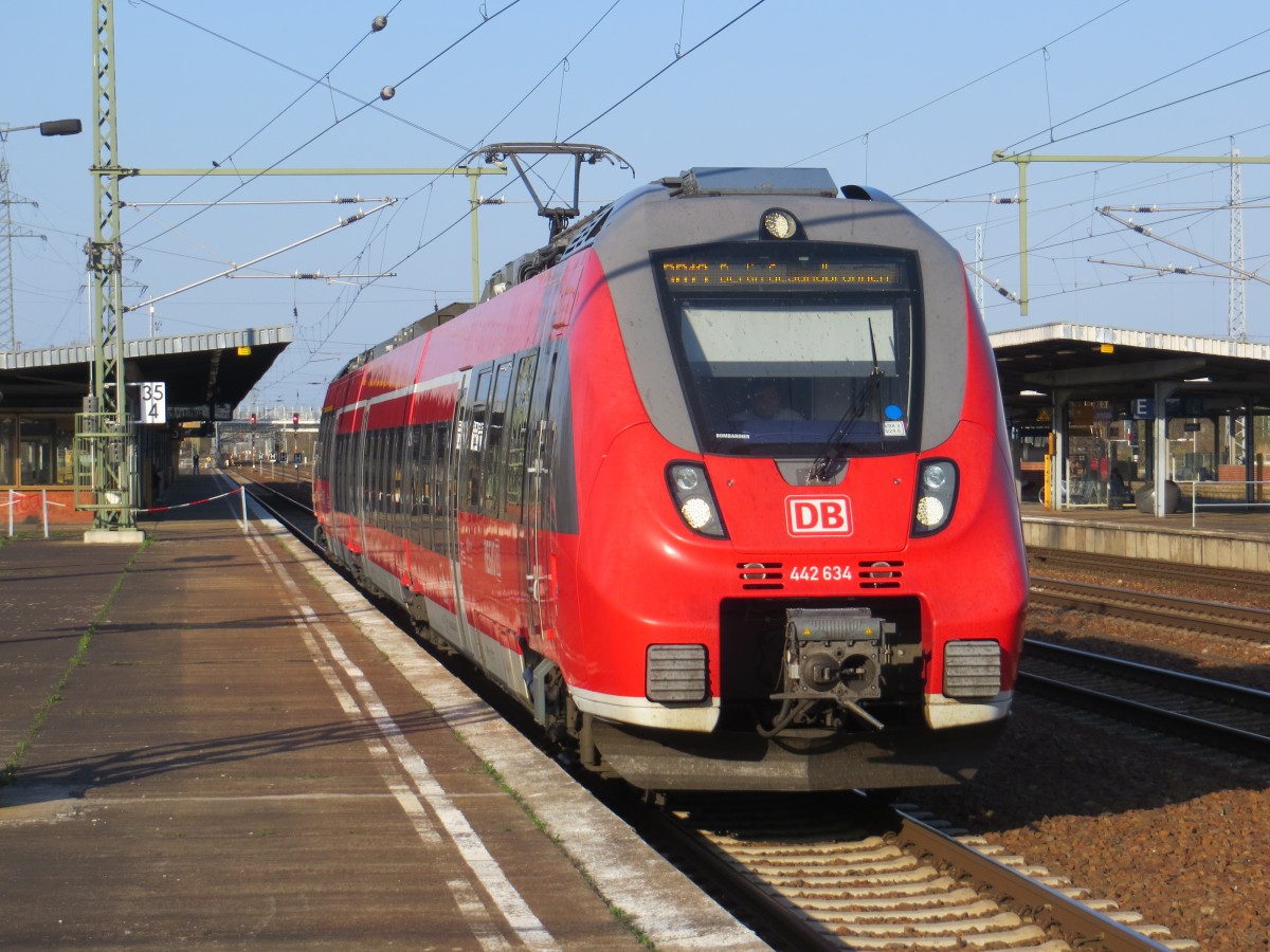 Der 442 634 von DB Regio Nordost fuhr am 15.04.2015 mit der RB 19 in Berlin-Schönefeld ab in Richtung Berlin-Gesundbrunnen.