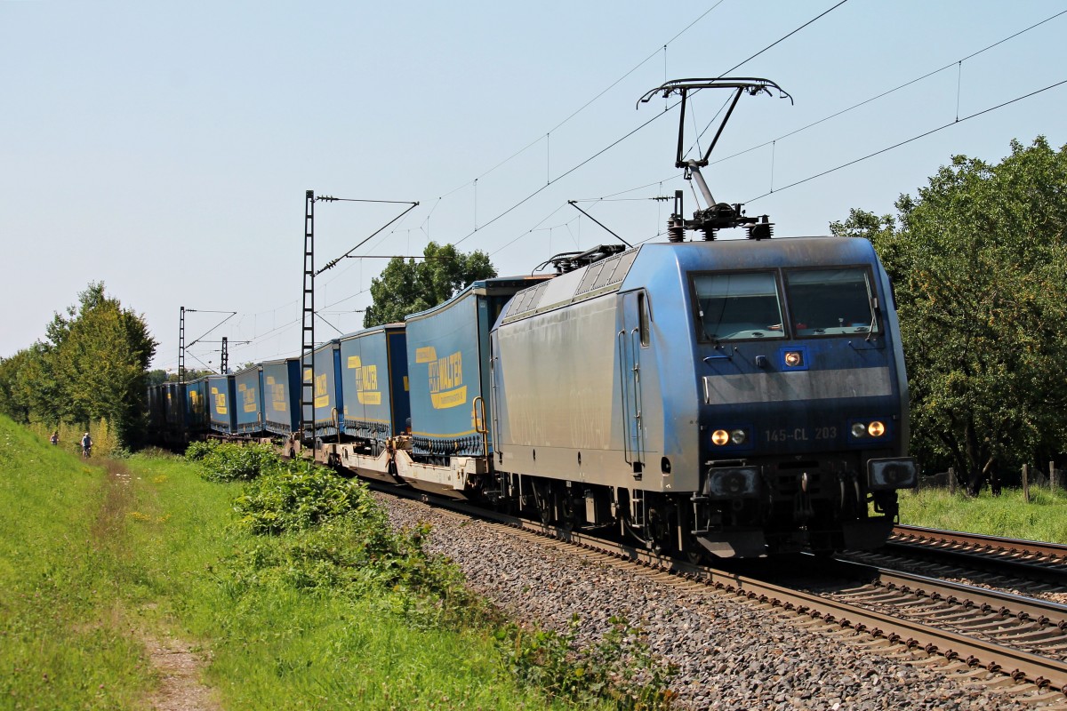 Am 01.08.2014 fuhr Crossrail 145-CL 203 mit einem LKW Walter KLV bei Kollmarsreute gen Schweiz.