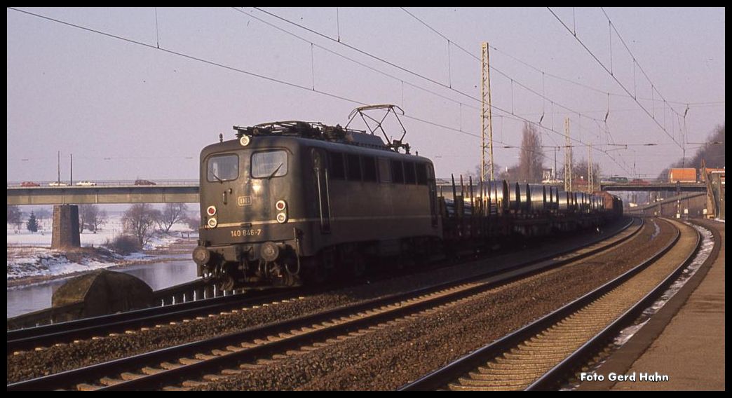An der Weser entlang fährt 140846 am 20.2.1991 um 15.15 Uhr mit einem Coilzug in Richtung Ruhrgebiet durch den Bahnhof Porta Westfalica.