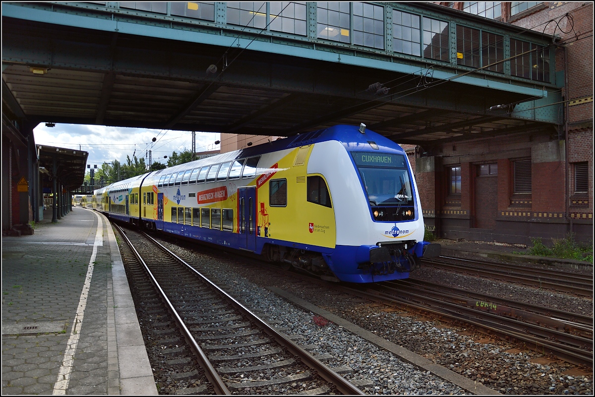 Bahnsteigbild ein wenig anders... Der Metronom nach Cuxhaven nach der Wende in Hamburg Harburg. Juli 2015.