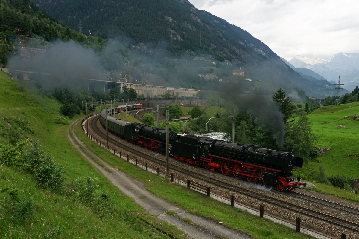Dampflok-Spektakel am Gotthard: Pacific 01 202 und 01 150 donnern am 27.06.2015 die Gotthard-Nordrampe hinauf und passieren die Wattinger-Kurve.