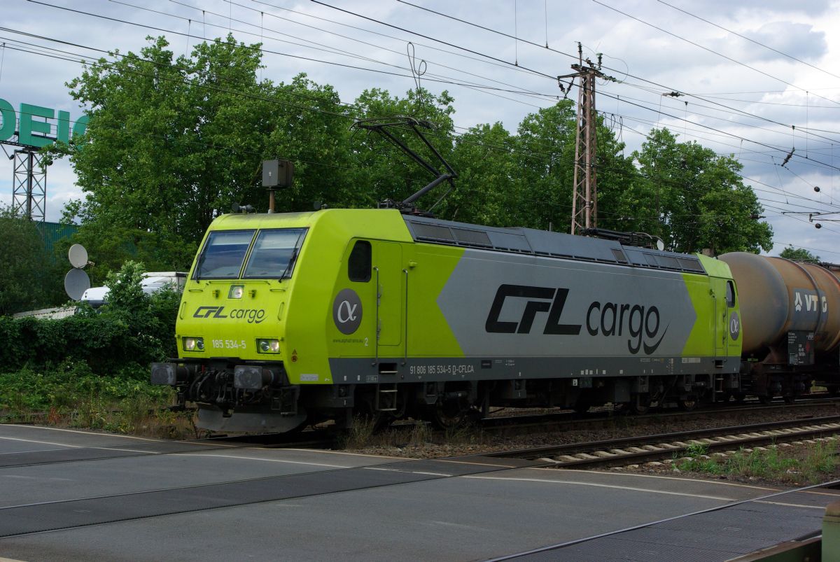 185 534-5 von alphatrains / CFL Cargo zieht am 21.7.2015 ihren Güterzug aus dem Bahnhof Bottrop Süd über den Bahnübergang Bahnhofstraße