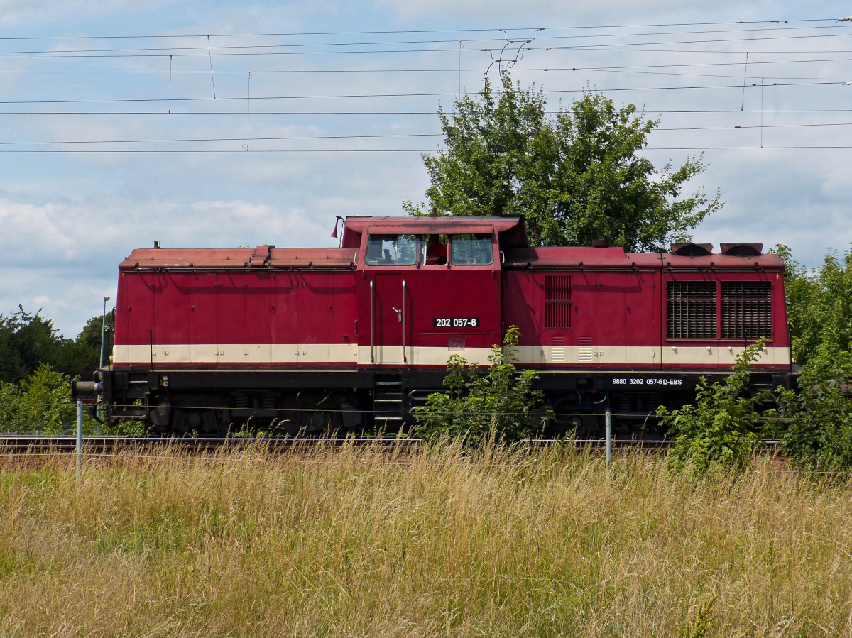 202 057-6 im Seitenprofil aufgenommen von einem Feldweg am Ortsrand von Nordhausen. Dazwischen eine Pferdekoppel. 15.07.2015.